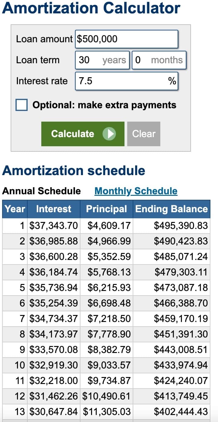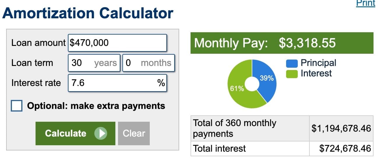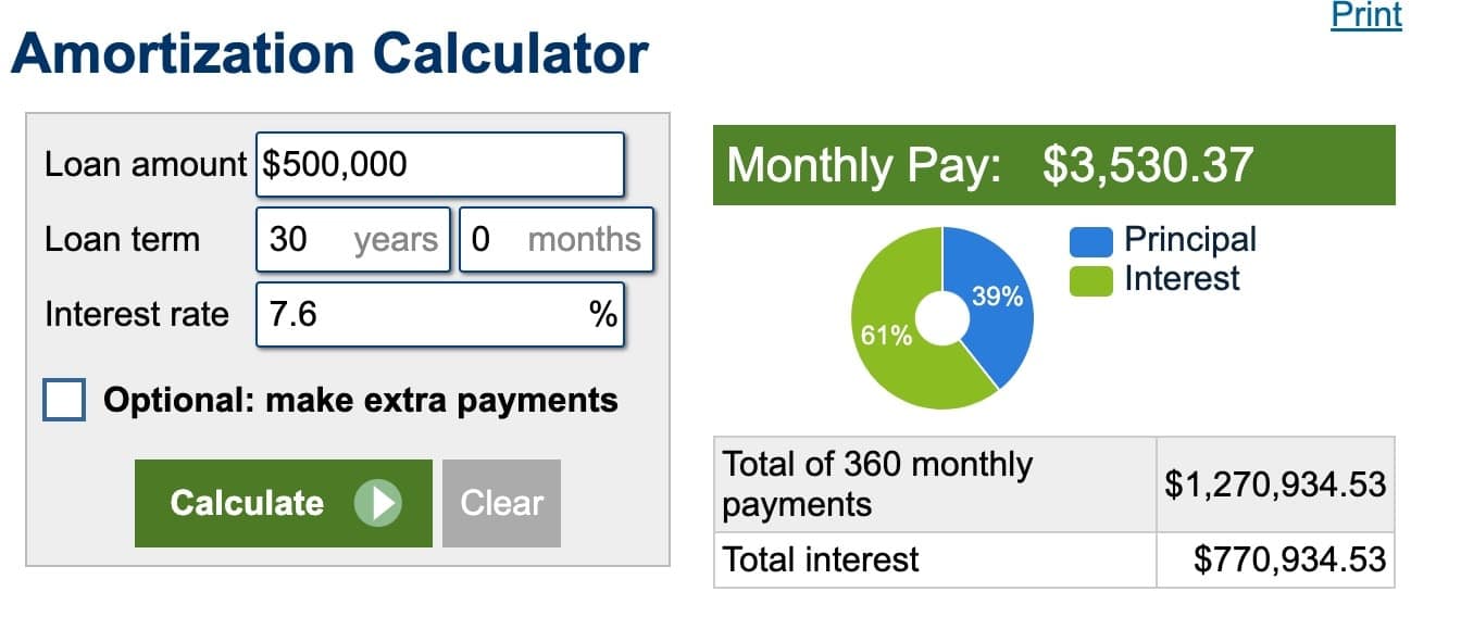 ^ A 500K loan at 7.6% has a monthly payment of $3530.37. ^