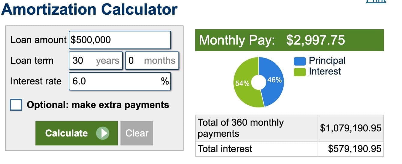 The same loan at 6% has a payment of $2997.50 for a difference in $532.87 per month. That can be a very significant difference for a buyer.