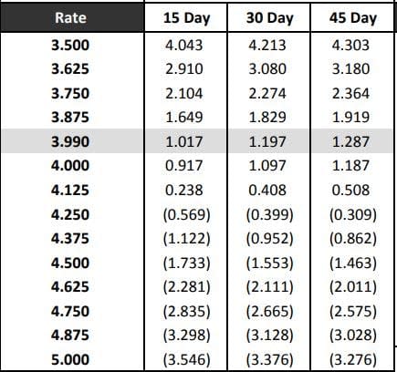 To learn about loan pricing, we are going to use the example rate and pricing sheet below. The columns are: